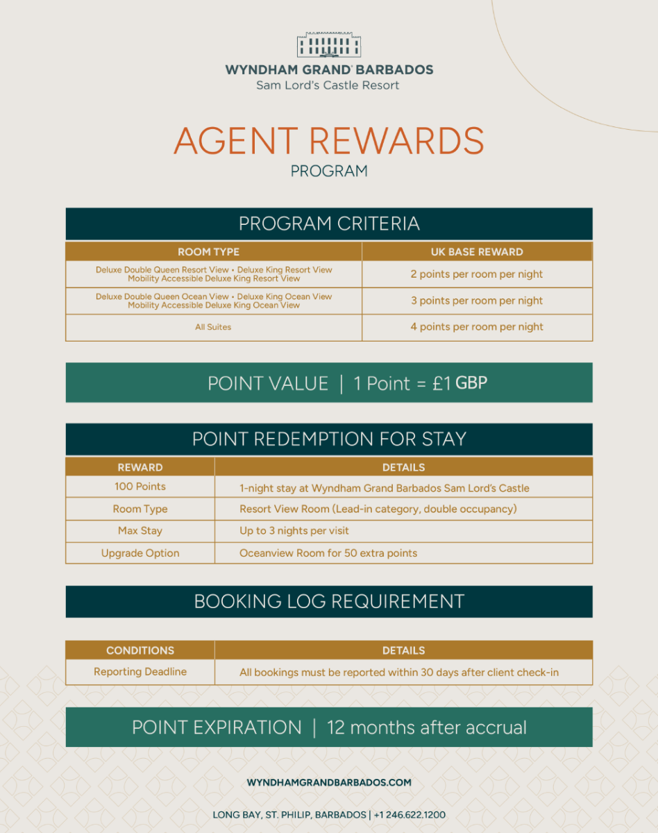 The Wyndham Grand Barbados Agent Rewards program is a new incentive designed to reward travel agents for booking stays at the Wyndham Grand Barbados Sam Lord’s Castle. The program offers agents the opportunity to earn points for every qualifying reservation, which can be redeemed for free stays at the resort. The program also includes the option for agents to upgrade their stays or extend their visits by using additional points.